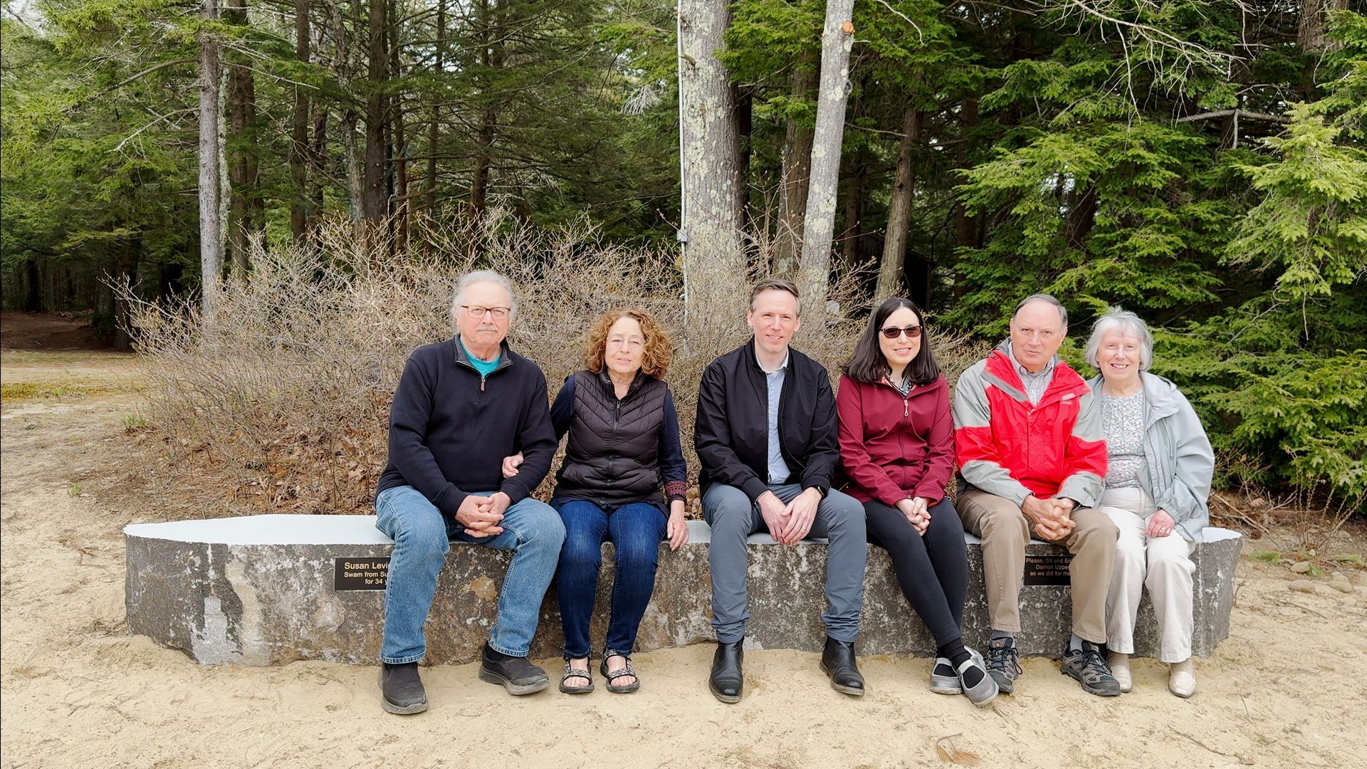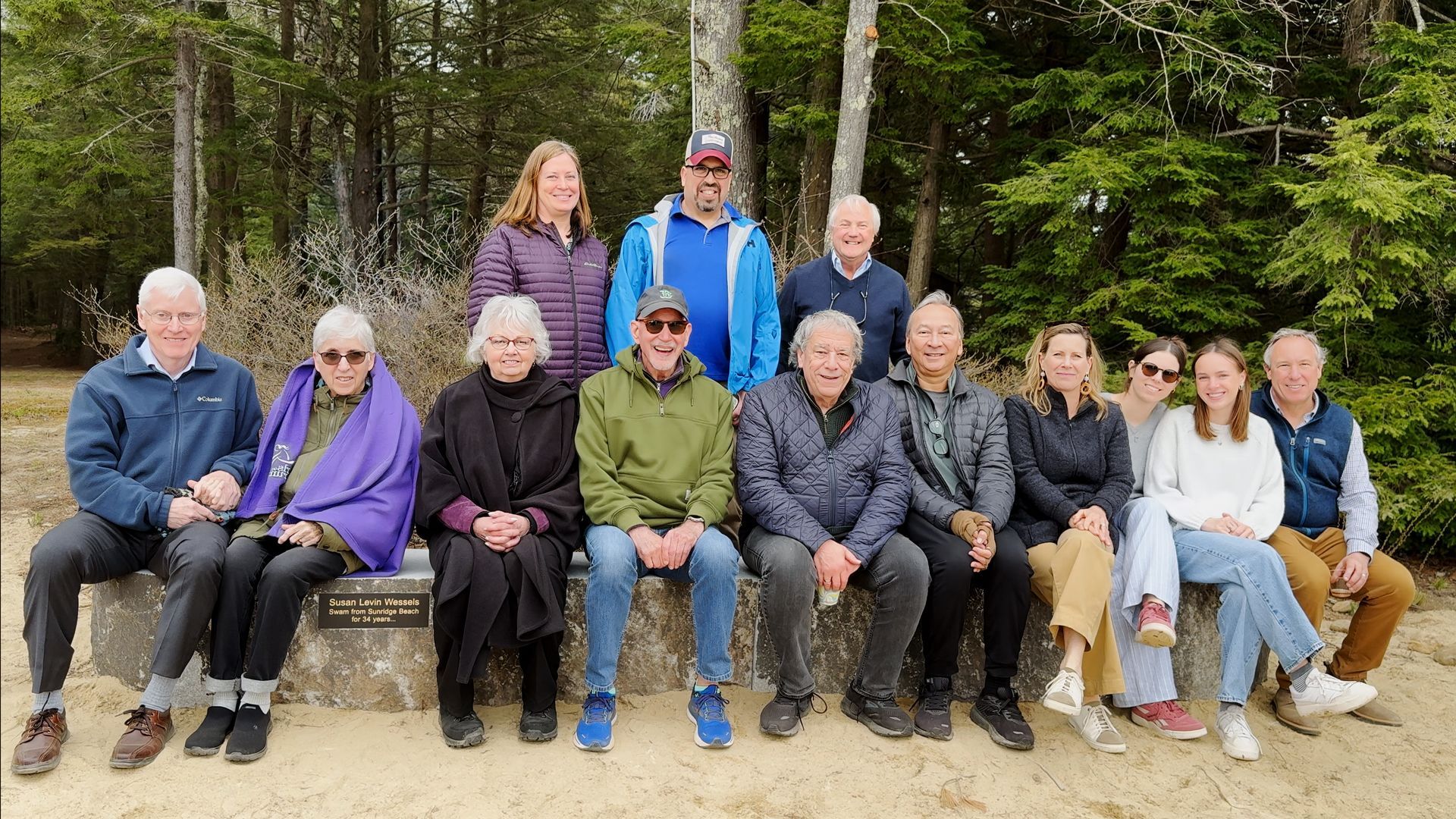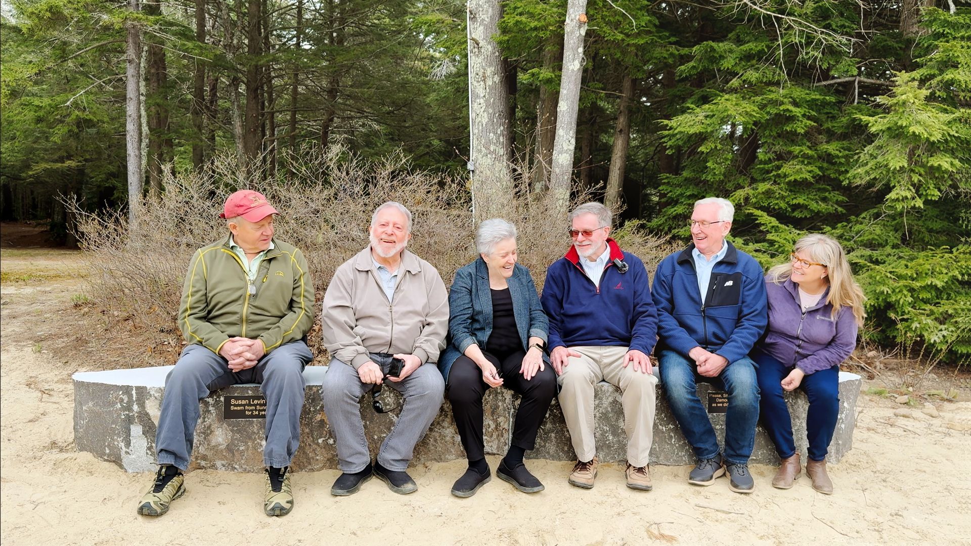 A monument for Susan came out of a conversation I had with John Hunt shortly after she died. He said we should have a monument on the beach for Susan who swam from Sunridge Beach for 34 years. So, in February, I got in touch with Broderick at Peterborough Marble and Granite Works. I showed him some pictures of the beach, and he showed me a bench he had made. He looked for materials for the monument and found some bridge blocks (a bridge block is part of a bridge) and thought he could do something interesting with them. So we figured out how we might fashion the piece into something you can sit on and enjoy. Prior to the monument bench being installed, I dug a hole that was 14 feet long, 40 inches wide, and over 12 inches deep in the beach sand. Over the years that Susan and I gardened, I had to dig all the holes, so it was fitting that I dug this one last hole for her. On Tuesday April 30th, they started to move the pieces onto the base, and Lynda Hunt and I watched them complete the work.