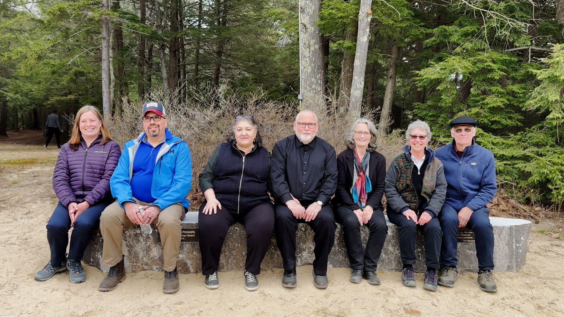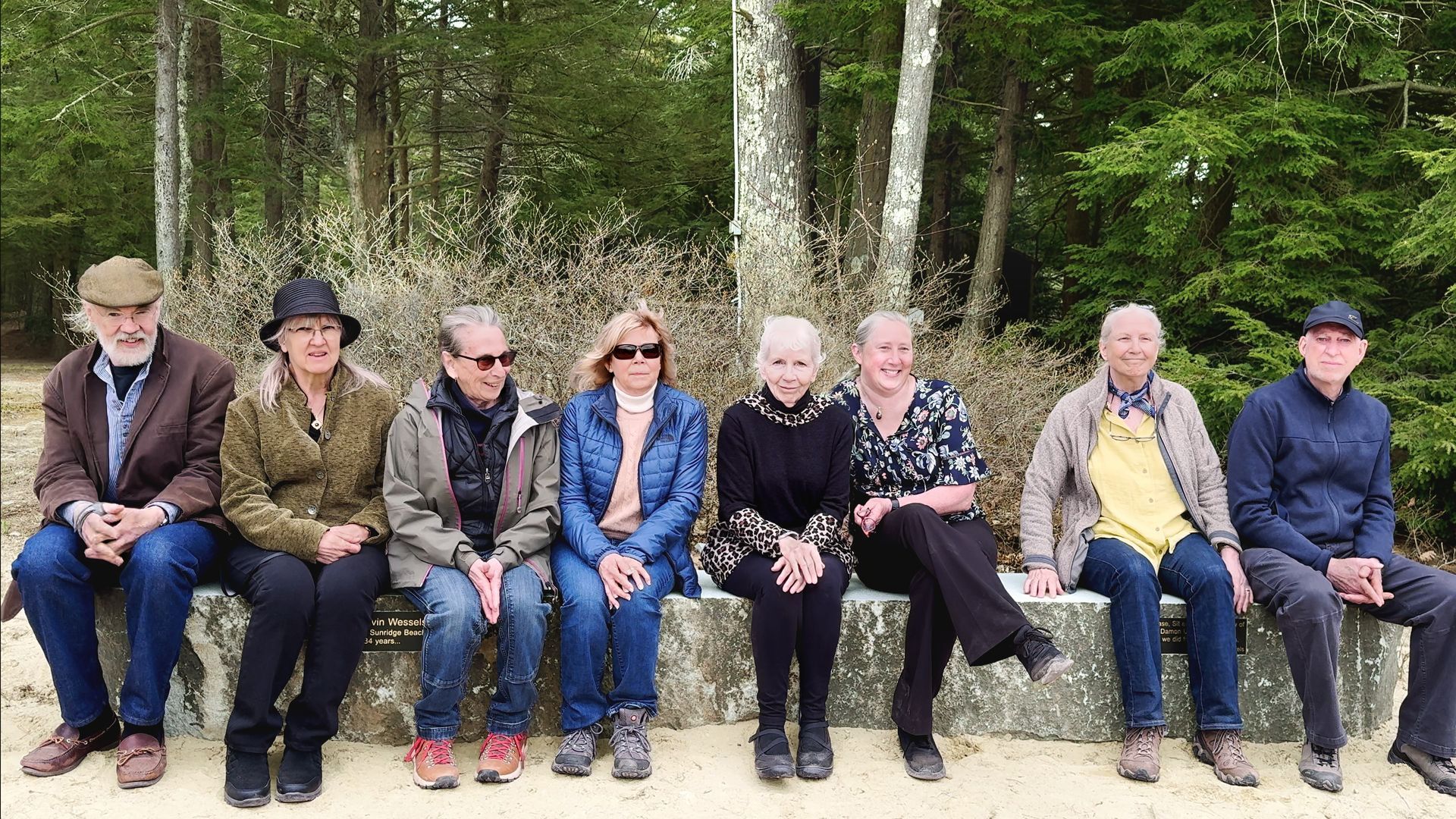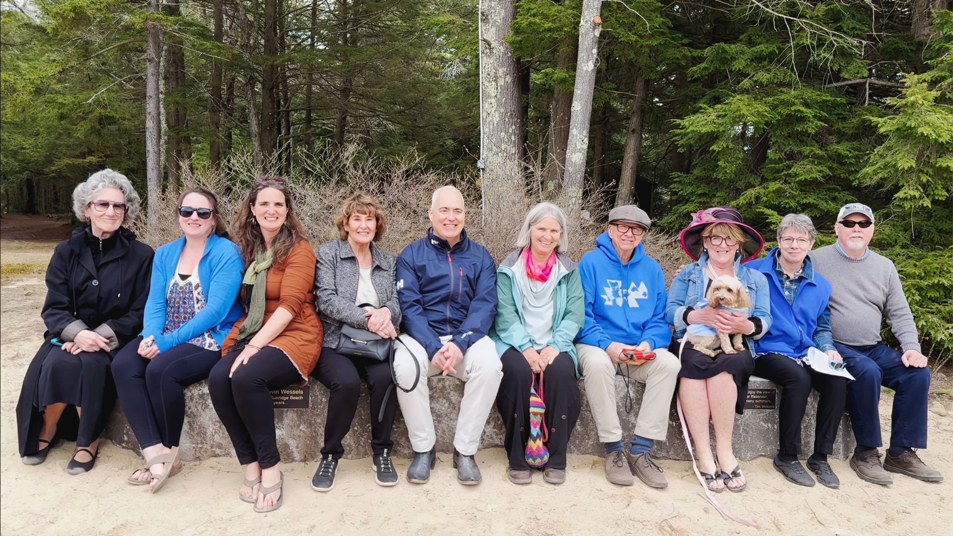 A monument for Susan came out of a conversation I had with John Hunt shortly after she died. He said we should have a monument on the beach for Susan who swam from Sunridge Beach for 34 years. So, in February, I got in touch with Broderick at Peterborough Marble and Granite Works. I showed him some pictures of the beach, and he showed me a bench he had made. He looked for materials for the monument and found some bridge blocks (a bridge block is part of a bridge) and thought he could do something interesting with them. So we figured out how we might fashion the piece into something you can sit on and enjoy. Prior to the monument bench being installed, I dug a hole that was 14 feet long, 40 inches wide, and over 12 inches deep in the beach sand. Over the years that Susan and I gardened, I had to dig all the holes, so it was fitting that I dug this one last hole for her. On Tuesday April 30th, they started to move the pieces onto the base, and Lynda Hunt and I watched them complete the work.